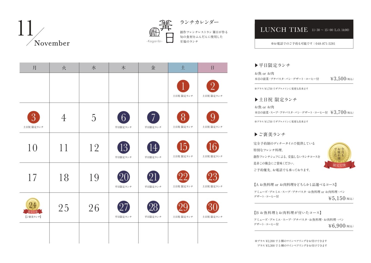 ■土日祝 限定ランチ 営業日…… 11/1、2、3、8、9、15、16、22、23、29、30