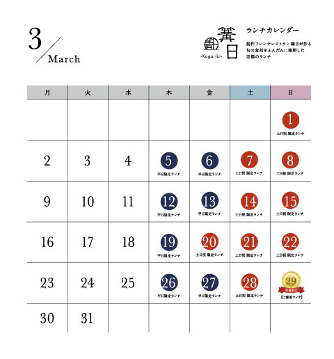 ■平日 限定ランチ 営業日…… 3/5、6、12、13、19、26、27